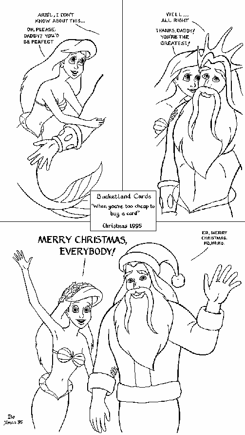 "Ariel's Christmas Surprise" (arixmas.gif, 503x890x2, 18486 bytes) is the 55th in a continuing series of fine Disney fanart drawings by Bob Ito <ito@[...]> and the 21st in the so-called "Bucketland Cards" series of handmade greeting cards, "when you're too cheap to buy a card."